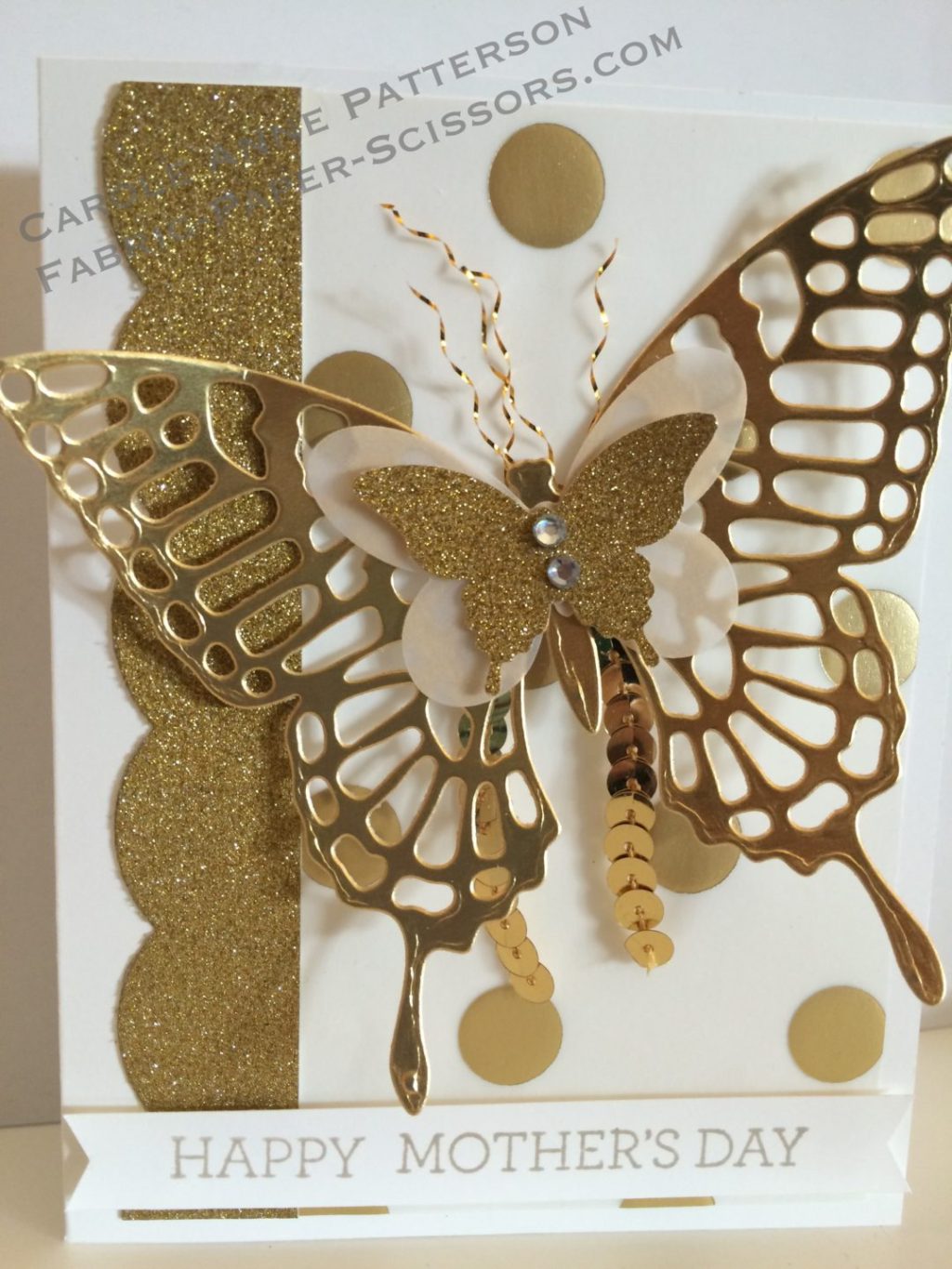 Here’s one the cards I created this morning for the Thursday Mother’s Day Card Class. The Butterfly and Scallop thinlets, gold paper, vellum and DSP gold add to the elegance of this card. Of course, there’s rhinestones…my favorite! Hope to see you Thursday!