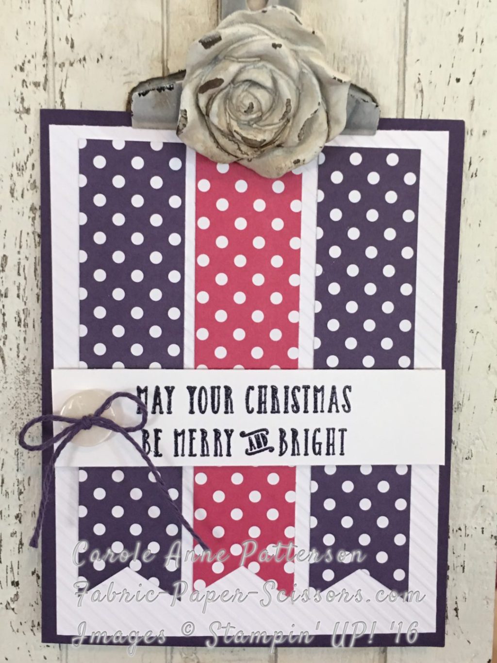 - Take a Classy Designer Button and turn it upside down, thread with Solid Baker’s Twine in Elegant Eggplant and tie in a bow.
