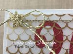 So the dilemma came about on how to adhere the top of the acetate to the cardstock. I hole punched two tiny holes in the upper left and upper right corners of the acetate and also through the Whisper White cardstock. Then I threaded the Gold Baker’s Twine, from the retiring Baker’s Twine Trio Pack, through the front, across the back and tied a bow in the front. Be sure to knot the ends of your long threads before you trim them. I used one of the stars from the edgelet leftovers. Use everything!