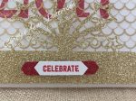 Another closeup and this die is from the NEW Occasions Catalog, it’s a cool design called Star Blast Edgelits Dies. Love it so much. It can be flat on a card and standing up on a box…wow!  I’ve popped this one up with Foam Adhesive Strips under the main section and one under the largest spot near the big star. Punch out a label from Real Red Glimmer Paper with the Classic Label Punch. Stamp the sentiment Celebrate with VersaMark on Whisper White and sprinkle with Real Red Glitter Stampin’ Emboss Powder, heat set. I punch the sentiment out with the Classic Label Punch, then trimmed the ends with Paper Snips to match the label. Adhere with cut in half Dimensionals.
