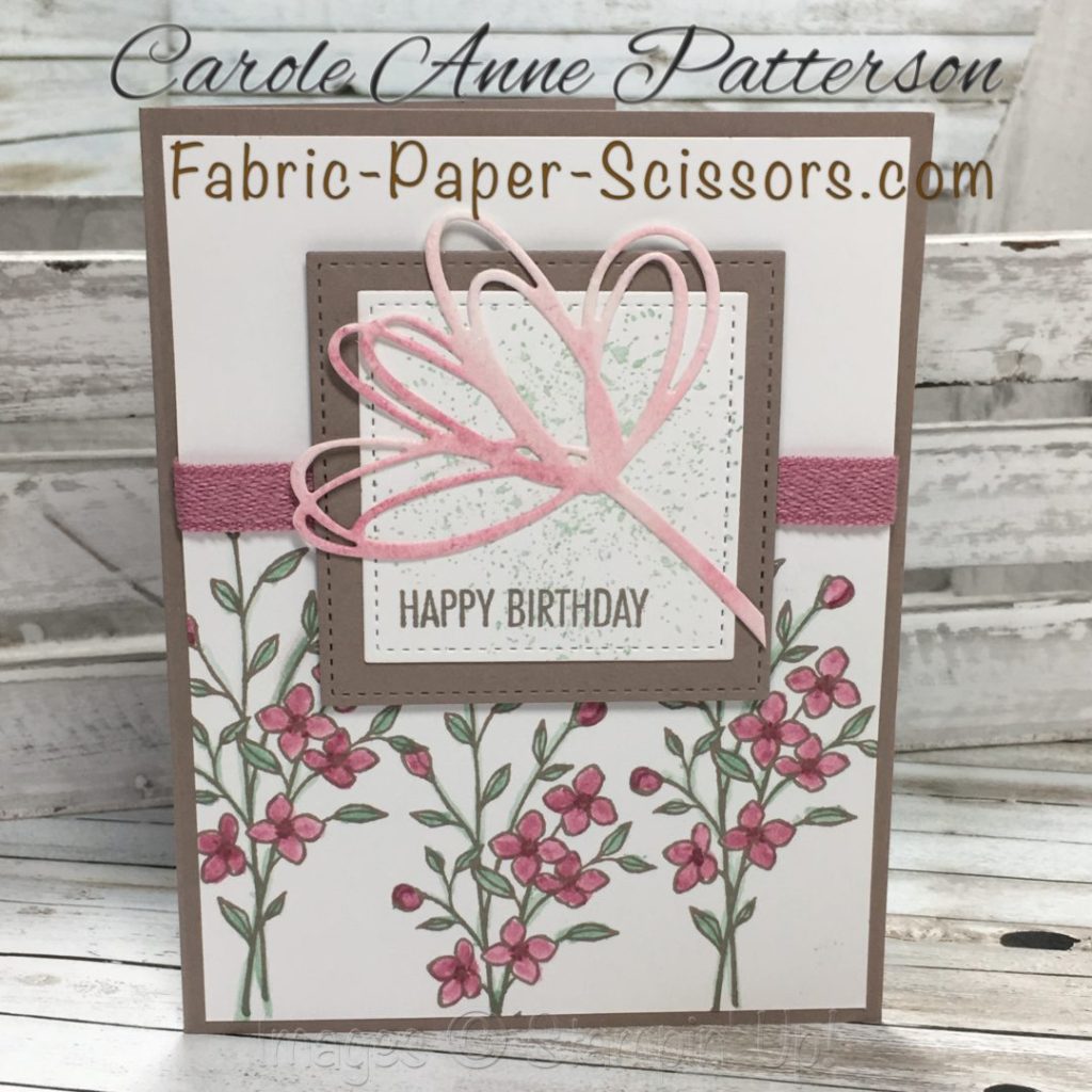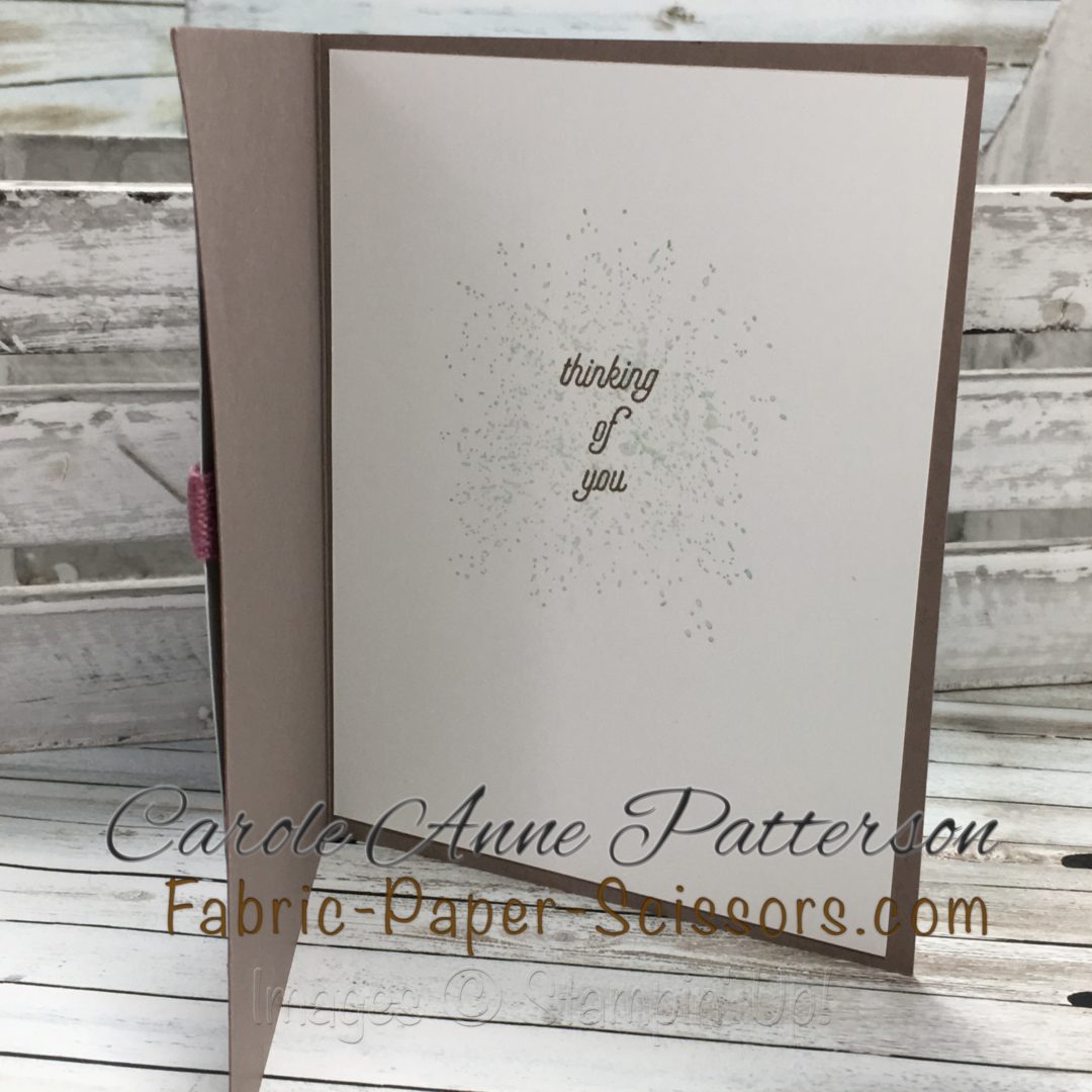 Assembly was easy. Attach the ribbon by running two strips of snail over the back of the Whisper White piece of Cardstock, then adhere this to the Tip Top Taupe Cardstock card base. Adhere the Whisper White square piece to the Tip Top Taupe Square piece using your favorite adhesive. I attached the watercolored flower to this using the Fine Tip Glue Pen but you could also use Multi-Purpose Glue and a toothpick to get a narrow bead. ย Attach this to the card using Dimensionals. To add a little glimmer, use Wink of Stella over the watercolor flower and in the center of the tiny flowers.
