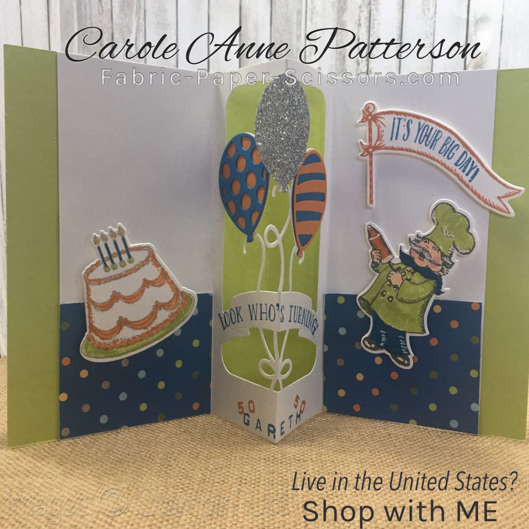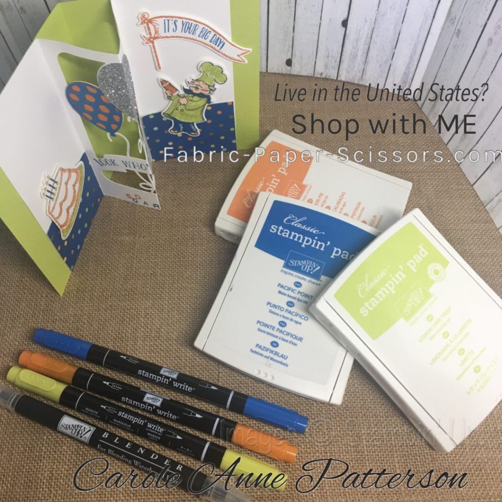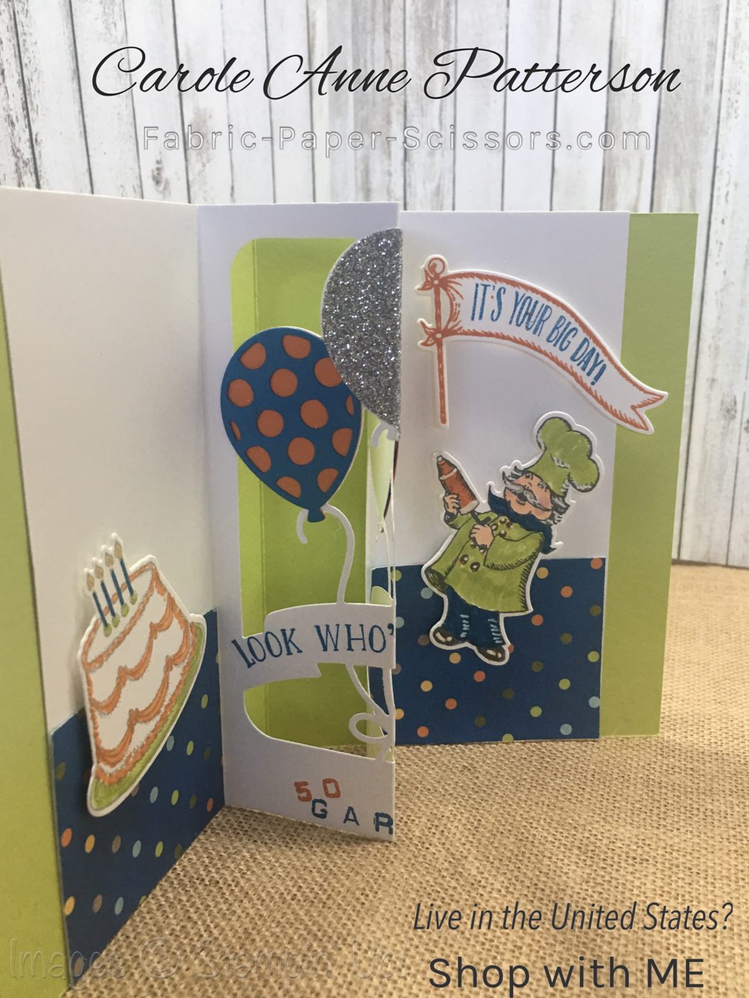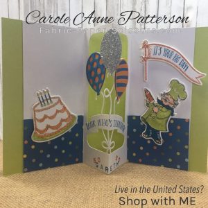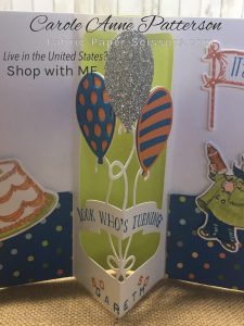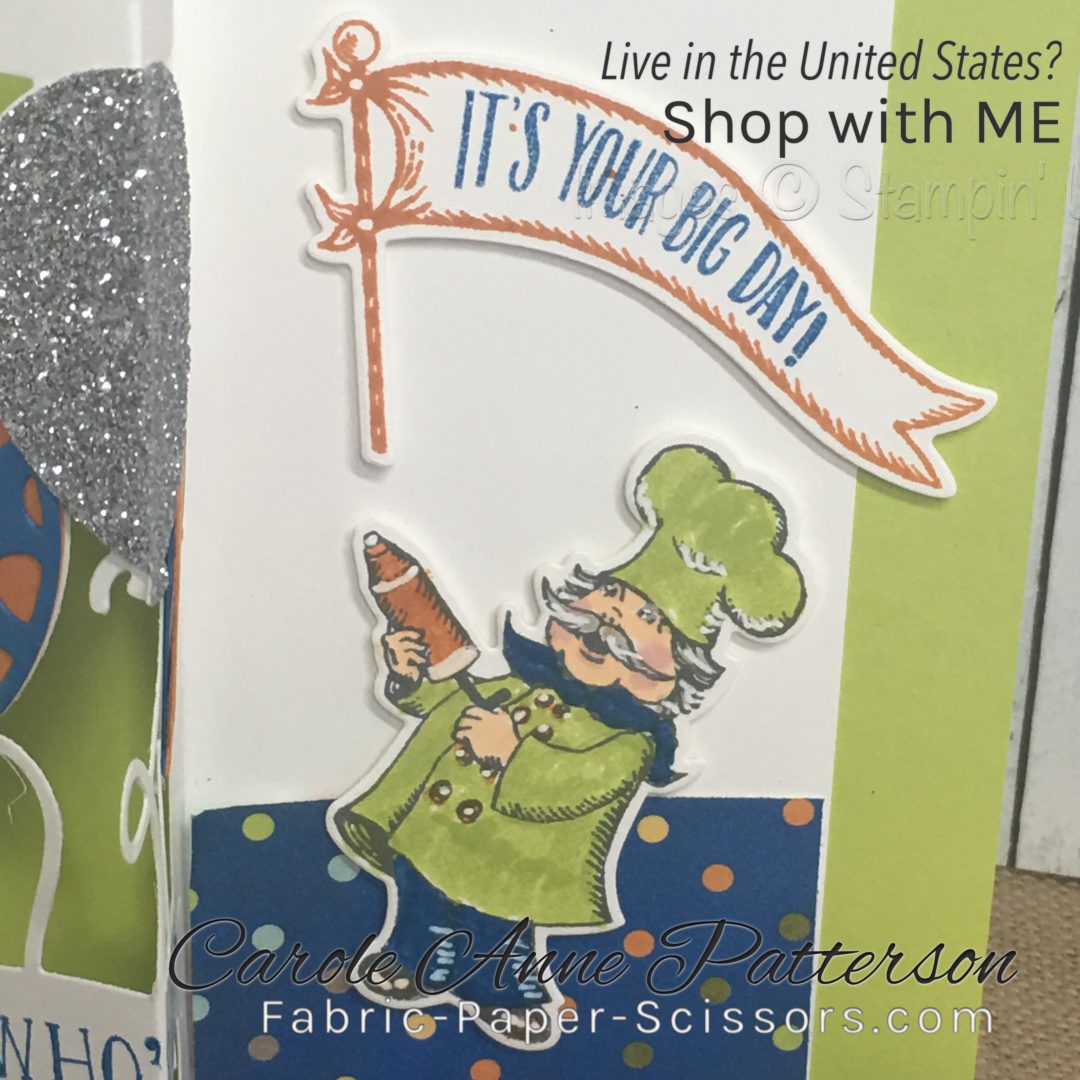Because I attended On Stage, I was able to pre-order a few things, well kind of a lot of things but I’m not telling how much. Look at the inside of the card! If you LOVE this as much as I do you’ll grab the Balloon Pop-Up Thinlits Dies right now because they are being discontinued and selling out. If one photo is good…then three are better right? I wanted you to see the full view of this great Thinlit! If you purchase, I’ll send you the full instructions on how to make this adorable card. Of course, buy the thinlits NOW and you’ll have to wait until the NEW Annual Catalog goes live to get the rest of the supplies. I used the Balloon Bouquet Punch for the die cut backings and for the Silver Glimmer Balloon. Every other die cut is with the NEW Birthday Friends Framelits Dies. They are so darn cute that I just smile cutting them out! I just love how the inside turned out! Hubby likes to cook so the “chef” has decorated the inside banner ๐ Cake and banner are part of the die cuts!