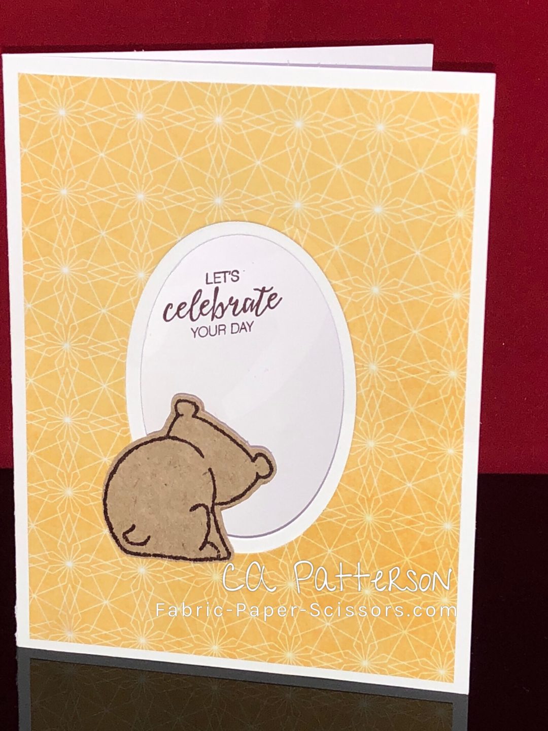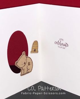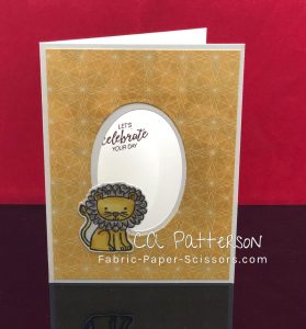 I stamped, die cut and trimmed around the Lion and the Bear so that they would be in two pieces…why? Well you an either put the front or the back of each cute animal on the front of the card, then glue the other part to the back so that when you open the card you see the other half of the animal. You can see what I mean in the photos below. Coloring on the cute lion was done with the new BLENDS. You’ve got to get them!!!