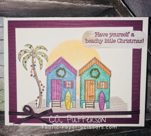 Assembly: Adhere the piece of Watercolor Paper with the sun to the embossed piece of Rich Razzleberry using Fast Fuse or Tombo Glue. Adhere the piece of Wood Textures DSP to the card using your choice of adhesive. Adhere the palm tree with combo to the card, then use Dimensionals on the back of the beach houses and attach them to the card. Attach a piece of 1/8″ sheer Fresh Fig Ribbon to both layers by wrapping around the back and tying a bow in the front. Pop up the sentiment with Dimensionals.