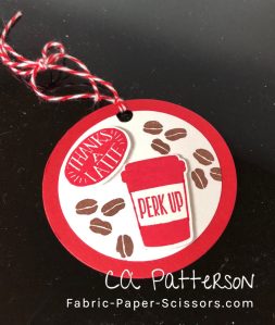 The cute tag is made using the circle cut from the box, adding a Whisper White circle plus a bit of stamping. The “Thanks a Latte” and the beans are from the Coffee Cafe Stamp Set. Sorry to say that the Perk Up stamp is retired but the label is adorable reconfigured with the Thanks a Latte in the middle with the beans stamped around it. Stamp the beans in Chocolate Chip first, stamp and punch out the sentiment using the framelit dies from the set. If you don’t have the dies, just fussy cut the oval.