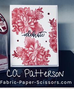 - Clean off the flower stamp and again using the Misti, attach a sentiment of your choice. I used celebrate for Valentine’s Day but celebrate could also be used for birthdays, anniversaries, etc. Stamp this using black ink. I stamped multiple times to get a really dark black image. This could also be embossed in black but I was going for simple.