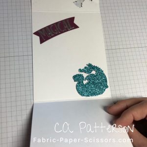 - Open the entire card, adhere the die cut Berry Burst embossed sentiment Magical to the card and add the tourquoise glimmer dragon to the bottom.