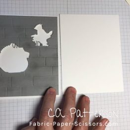 - Take the piece of brick embossed Smoky Slate and cut pieces to place on the card to look like a castle wall. This is the same technique shown in the Occasions Catalog. It gives a cool effect. Before adhering to the card, over them with Smoky Slate ink and a dauber to create grey areas before adhering to the card.
