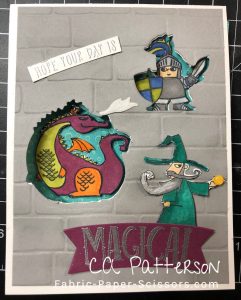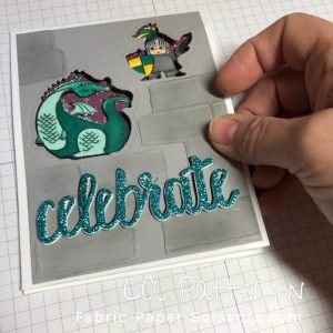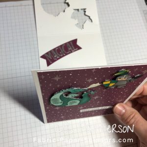 - Adhere the Smoky Slate die cut piece to the card front. As in the photo, snip out the paper pieces by the dragons wings and the knights sword. This will make it easier to fit and open…plus they are an unnecessary annoyance.