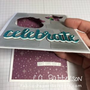 - Adhere celebrate to the front….WHEW! I think I got it all down and it’s done but remember to decorate your envelope! You can use the Smoky Slate stamped images.