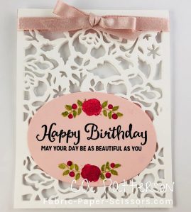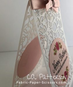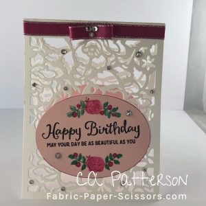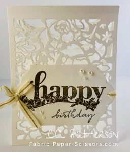 This is a very elegant card that can be used for a wedding, shower or birthday. It’s not difficult but looks like it is…that spells perfect for me!
