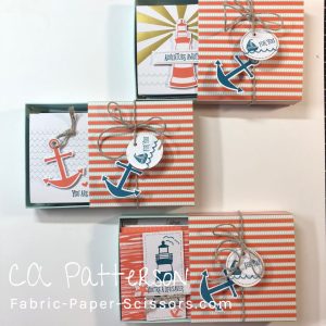 For the extra projects that will house one card plus a gift card I used the Mini Pizza Boxes. These are food safe on the inside and you can stamp the outside. I wanted extra gift boxes for graduates and these are perfect for the boys. I decorated the sides with the stamps and ink from the You Are My Anchor April 2018 Paper Pumpkin kit. I stamped the water using Tranquil Tide and the boats in Calypso Coral. I put a sentiment on the front of each box and put a piece of tissue paper (cut to size) inside.