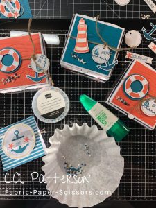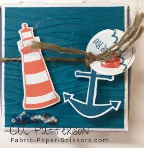 I cut Tranquil Tide and Calypso Coral Cardstock 3-1/4″ squares, ran them through the Big Shot using the Seaside Embossing Folder. I adhered the 3-1/4″ square to the top of the Pizza Box using Multipurpose Liquid Glue–love this stuff! I punched small holes on the flaps of the sides near the top and ran a piece of twine through the back and tied it in a knot on the top. Added an anchor and a tag and tied another knot. There’s lots of goodies left over from the kit to use on other projects. PP is very generous.
