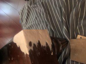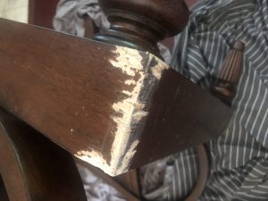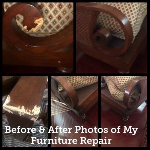 Now I’m taking control and trying to repair these on my own. There’s a video on YouTube by Bruce Lach titled “how to repair dog bites in furniture”. Perfect. It’s his business—guess I’m not the only one with this problem!!! Unfortunately, he’s nowhere near me but I feel hopeful that I can do this or at least they’ll be improved. I purchase Sculpwood Putty and got mstarted. I’ll post more photos when it’s dry and more as I try to match the stain. It’s a work in progress.