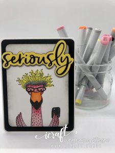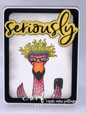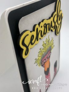 The word die is also from Picket Fence Studios and can you guess…it’s called Seriously plus it comes with the backing die!!! I put a scrap piece of black cardstock over a piece of a Sizzix Adhesive Sheet and die cut it twice. So much easier to use an adhesive sheet to get these letters backed with adhesive. I used a piece of Lawn Fawn yellow cardstock for the backing and I also cut a piece of white foam (purchased from Simon Says Stamp) to pop up the piece. Before I put this piece together, I used a copic marker in Black to go around the edges of the yellow back piece plus the white foam. I wanted it to be a bold statement and pop off the card…it does!