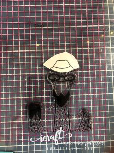 I trimmed the white cardstock to 3 x 4.75″, rounded all of the corners with my cropper. Backed this with a piece of white foam cut just a bit smaller and I used liquid glue to adhere. The black cardstock is 4-1/8 x 5-1/4″ (approximately) and the card base is 4.25 x 11″ (scored at 5.50″). I colored the images with Copic Markers, trimmed it to 3 x 4.75″ and rounded the corners.