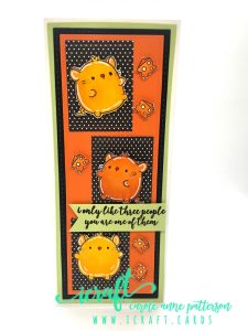 I used the dies from the Pink Fresh Essential Slim Cuts to cut the cardstock from Concord & 9th–Marmalade, Sprout and Black. The patterned paper is from a taylored expressions set called Playful Patterns–Haunted and I cut this with the Lawn Fawn Foursquare Backdrop. I didn’t use the window cut but used the three rectangles…have one to spare!